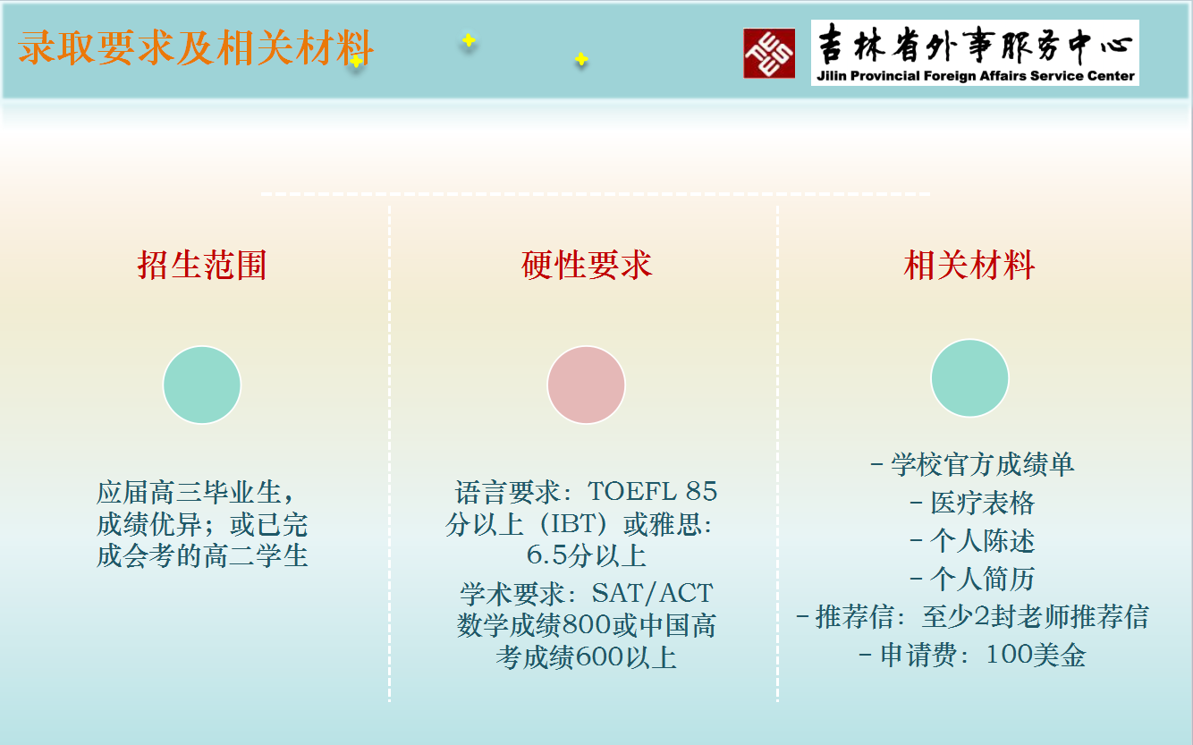 奖学金项目招生范围:应届高三毕业生或已完成会考的高二学生奖学金项目要求:TOEFL 85分以上(IBT)或雅思:6.5分以上,SAT/ACT数学成绩或中国高考成绩。