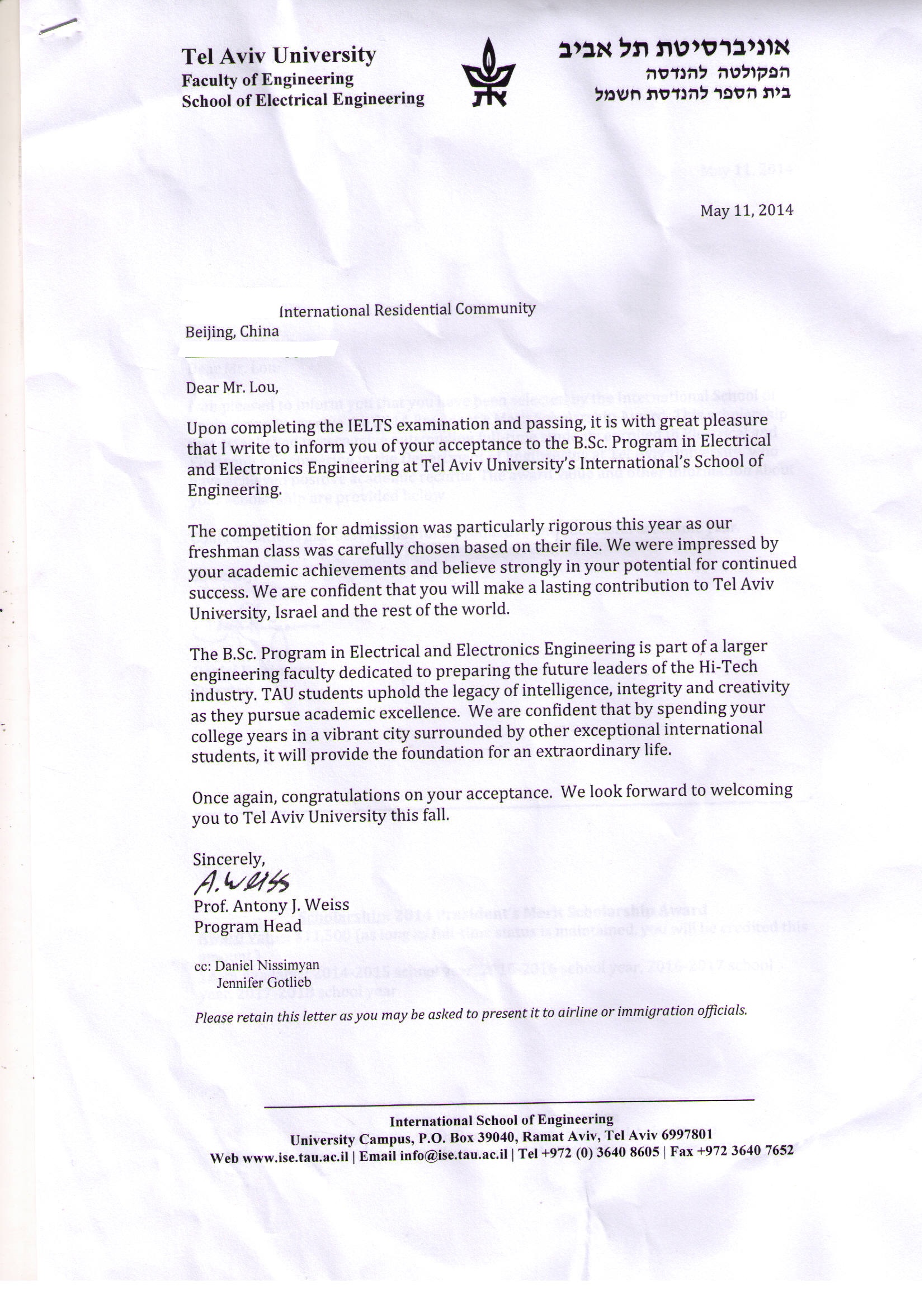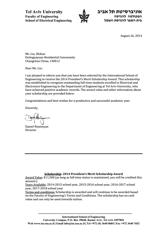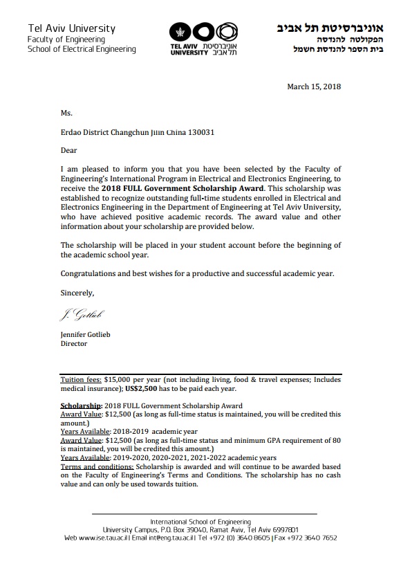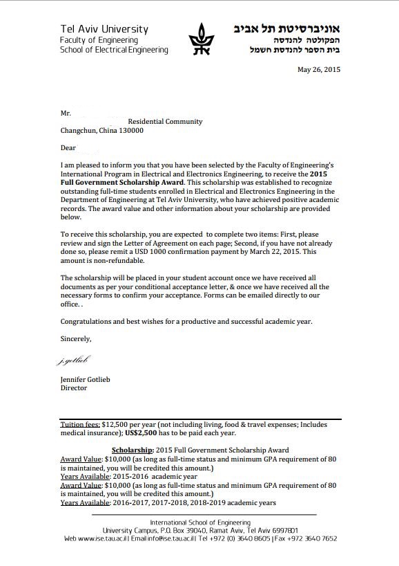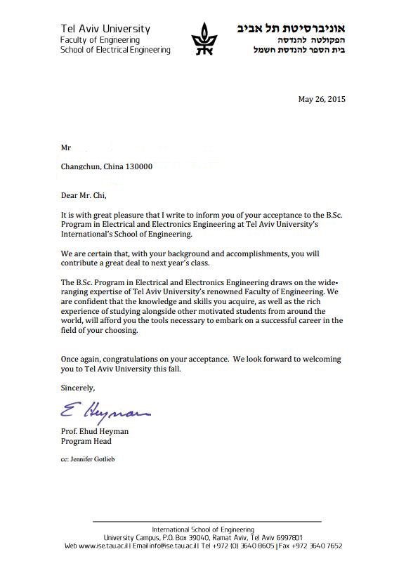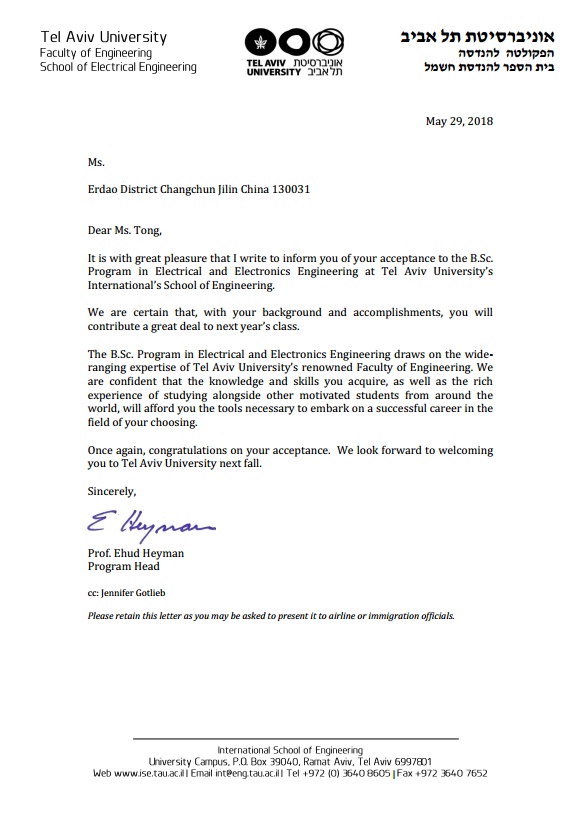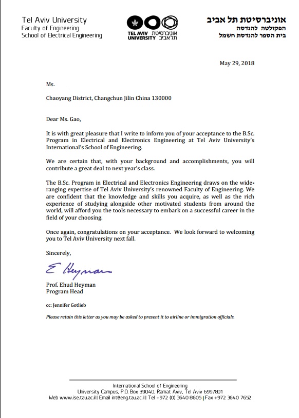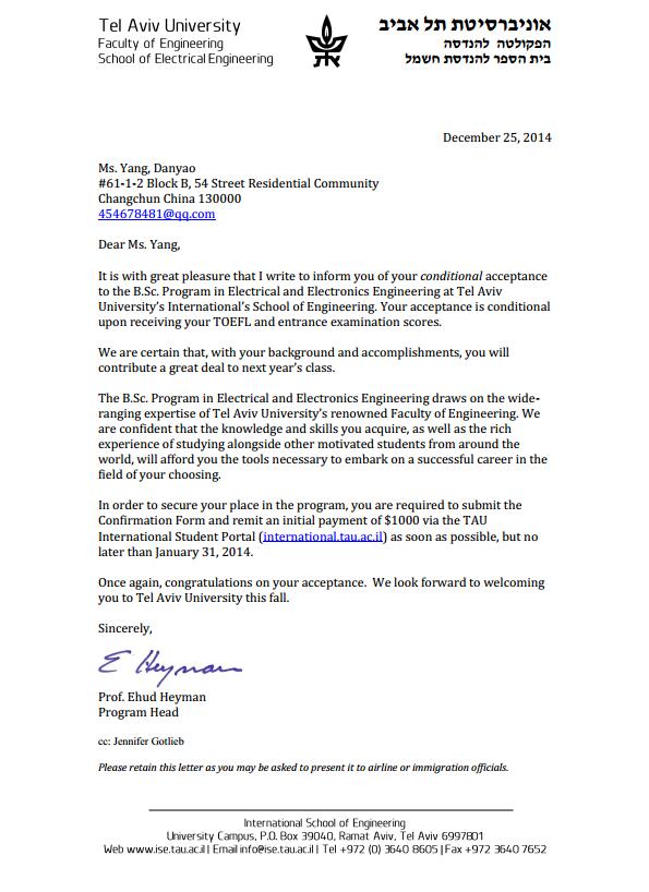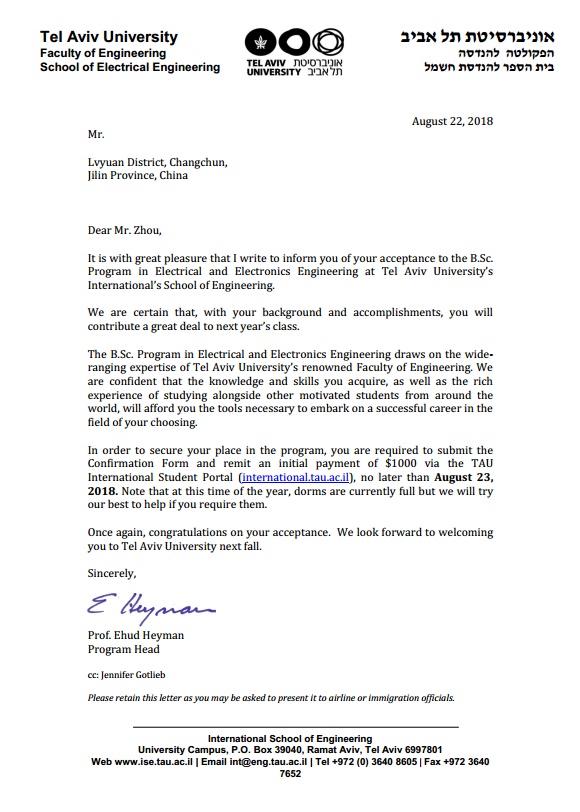 以色列录取通知书