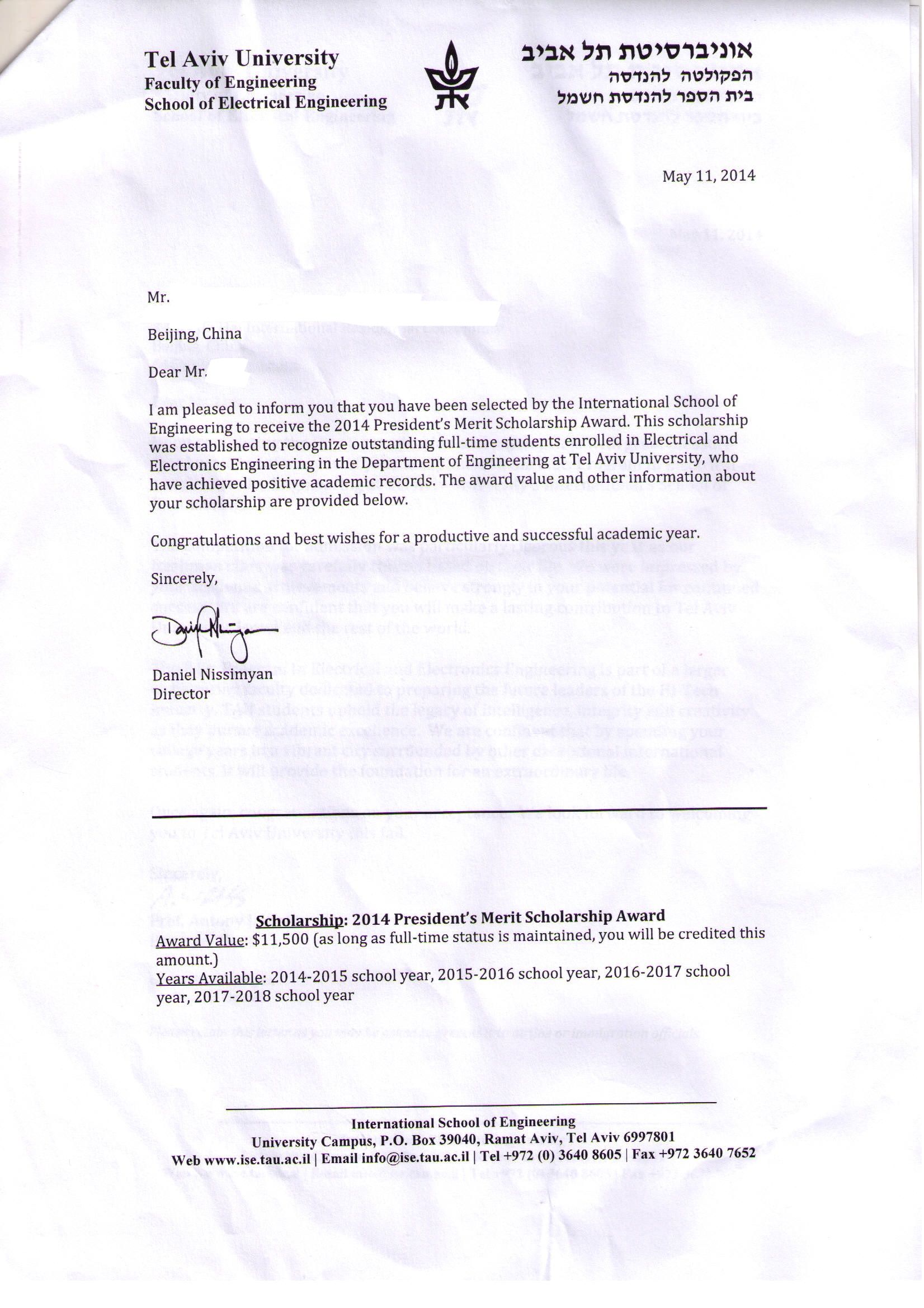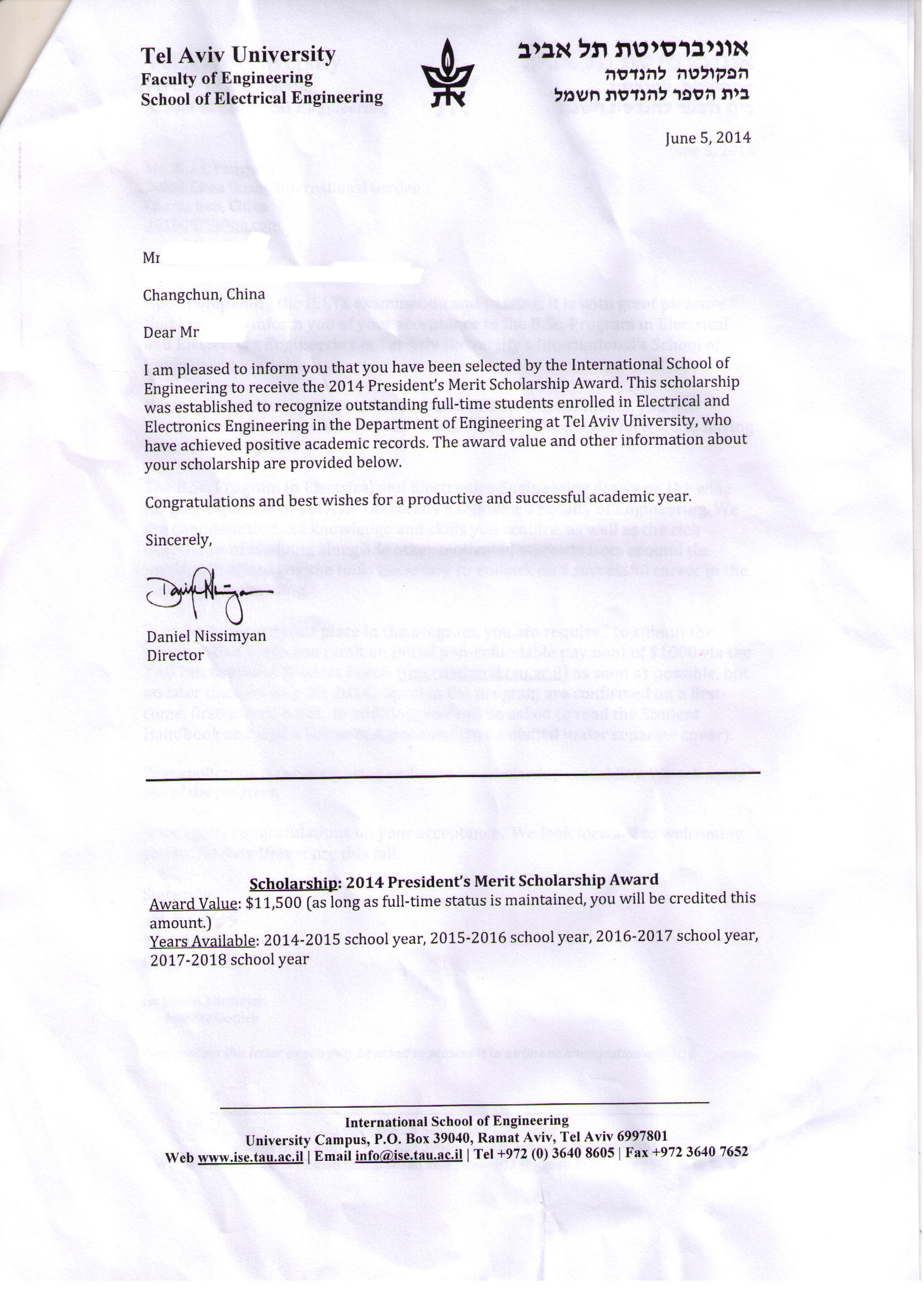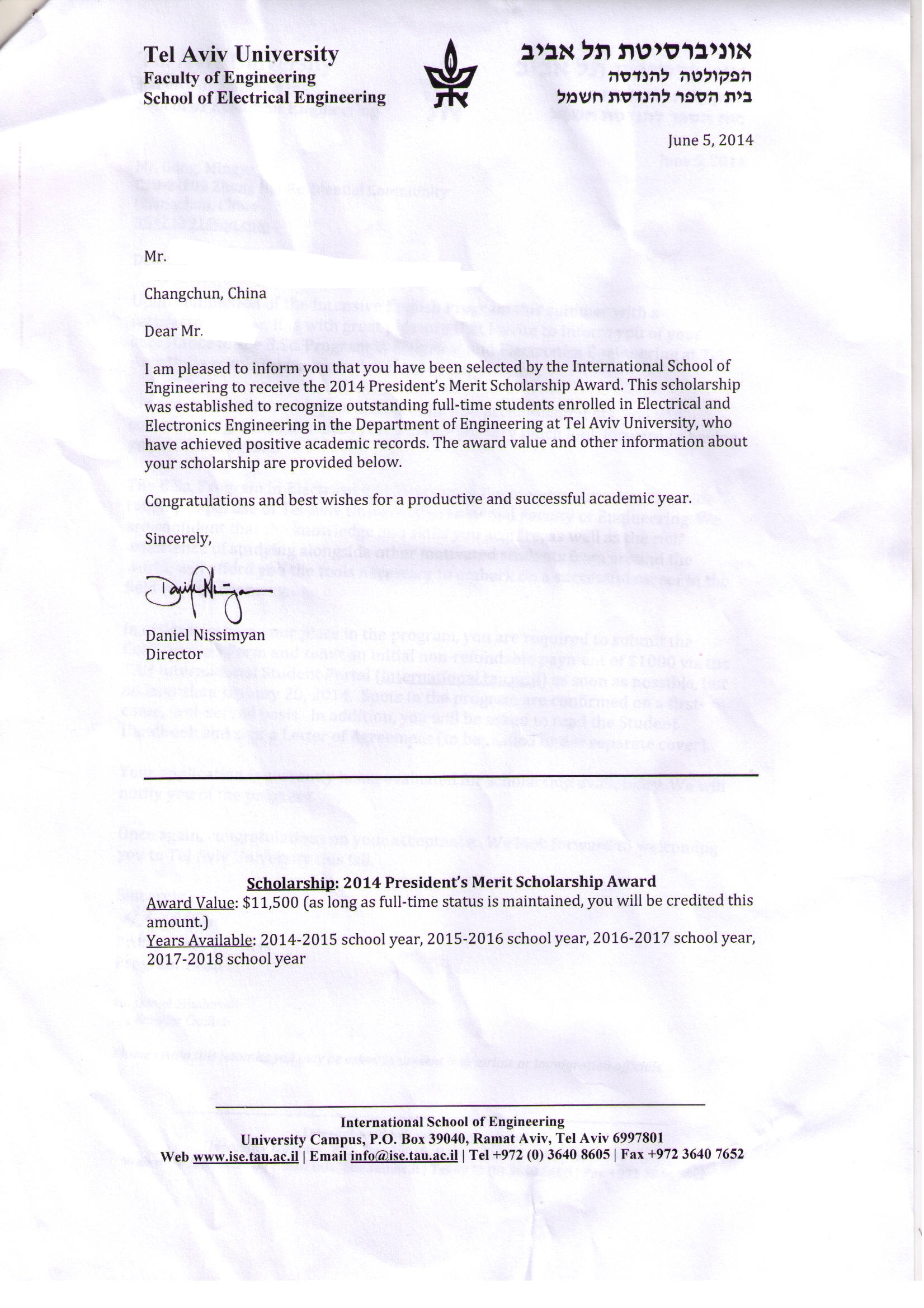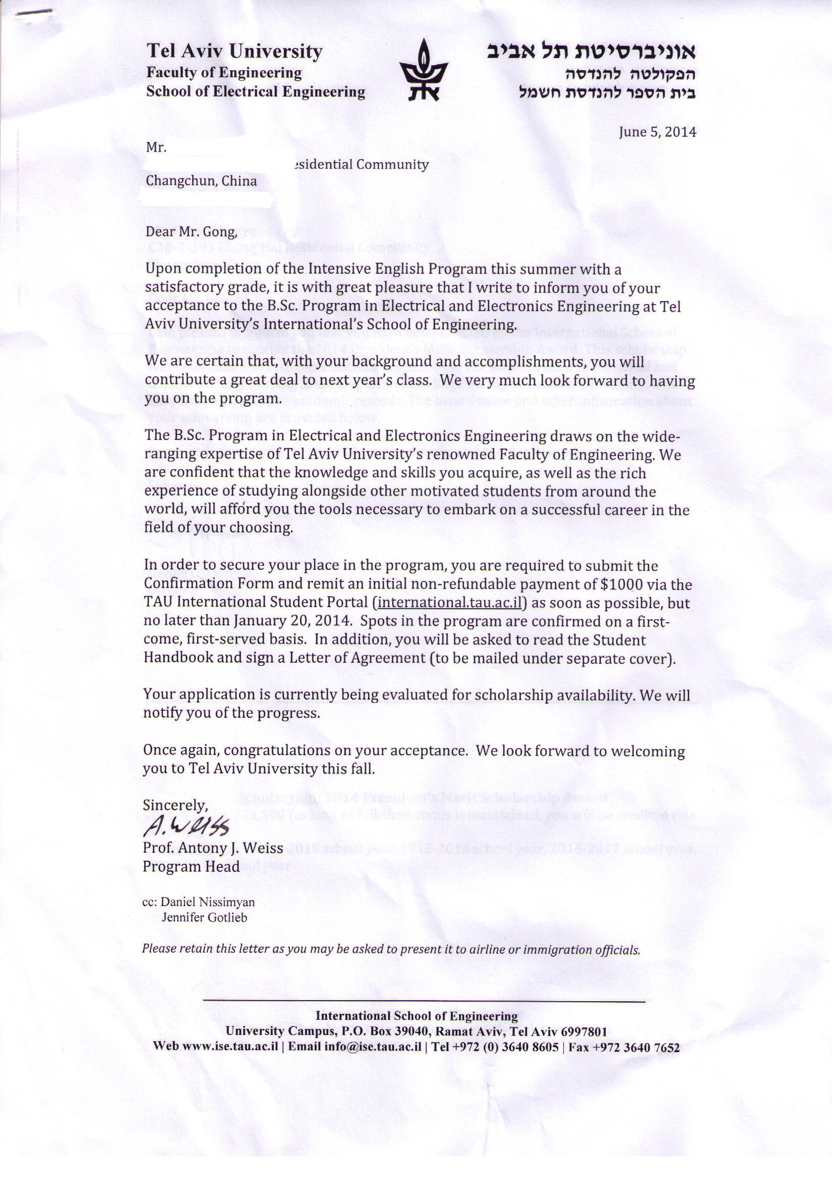 以色列录取通知书